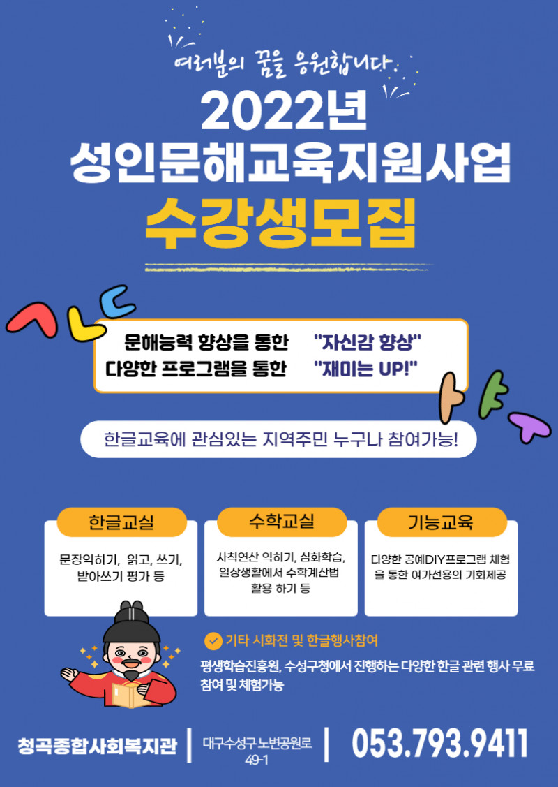 2022년 성인문해교육지원사업 선정에 따른 신규 수강생 모집