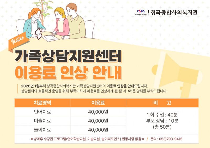 2026년 청곡 가족상담지원센터의 더욱 효율적인 운영을 위해서 아래와 같이 상담센터 이용료를 인상하게 되었습니다.