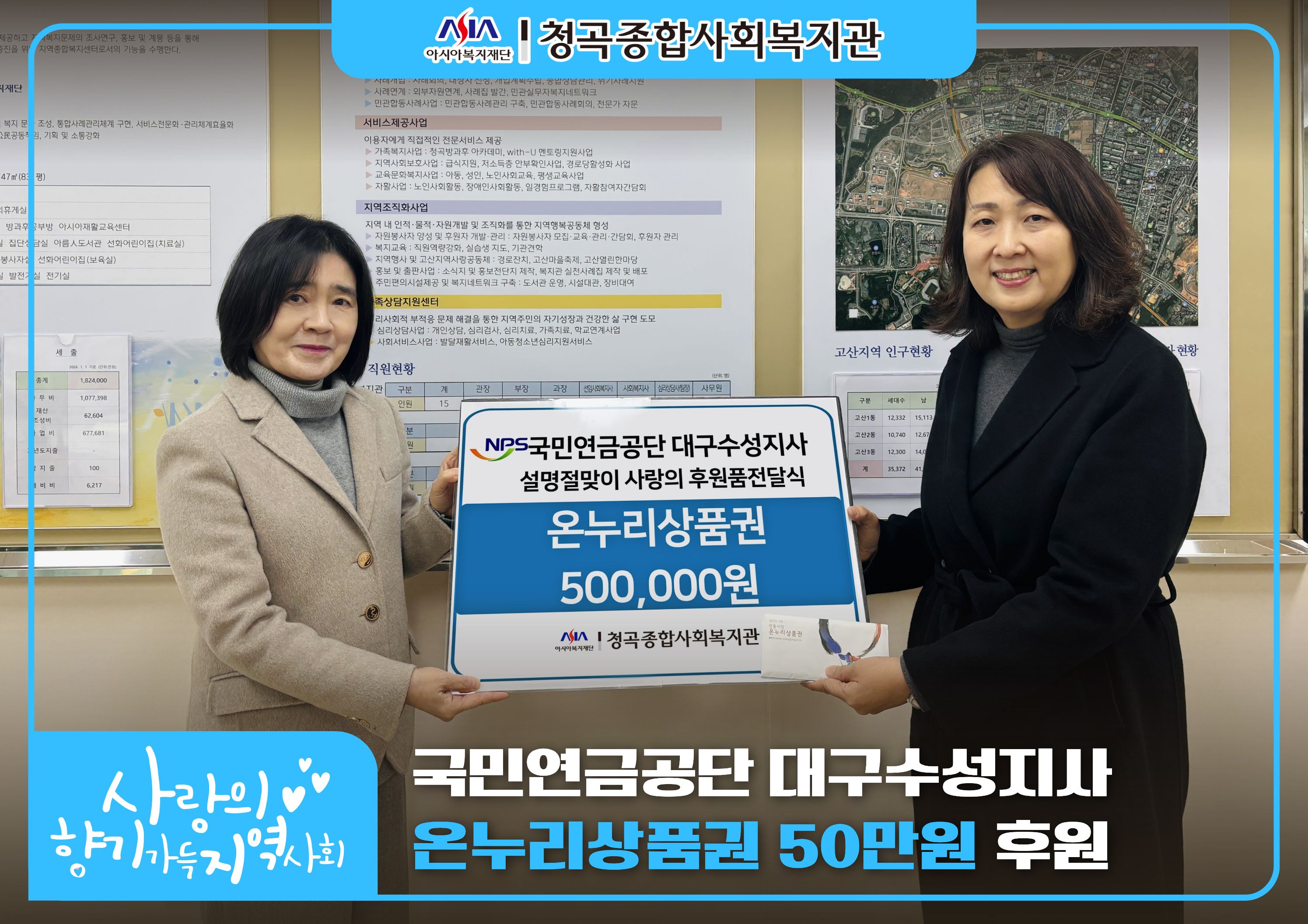 국민연금공단 대구수성지사에서 온누리상품권 500,000원을 후원해 주셨습니다.