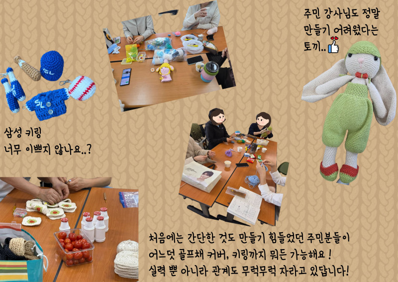 참여자들은 손뜨개 활동을 통해 차분히 작품을 완성해가며 성취감을 느끼고, 서로의 솜씨를 나누며