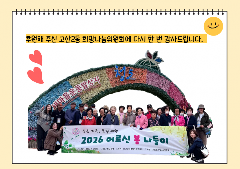 매년 고산2동 희망나눔위원회가 후원해 주시는 어르신 봄 나들이가 4월14일(화) 청도에서 진행되었습니다.