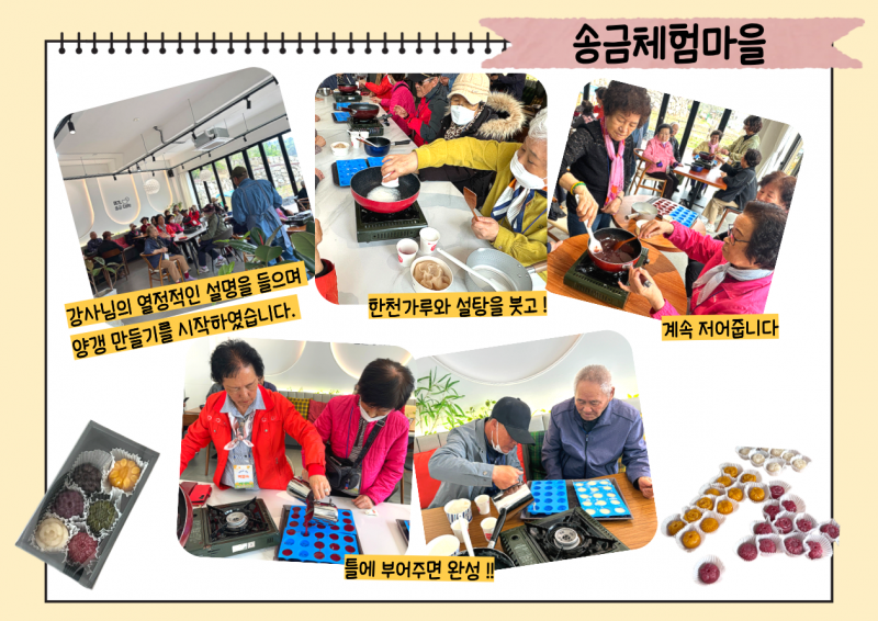 또한, 송금체험마을에서 알록달록 오색양갱만들기 체험을 진행했습니다. 어르신들께서 직접 정성껏 양갱을 만들었으며,